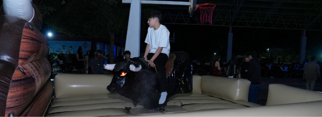 El ambiente estuvo lleno de energía con el toro mecánico, que se convirtió en uno de los grandes atractivos del evento, arrancando aplausos y carcajadas entre quienes se animaron a demostrar su equilibrio. Además, los estudiantes disfrutaron de una cena preparada especialmente para la ocasión, generando un espacio de convivencia y compañerismo.